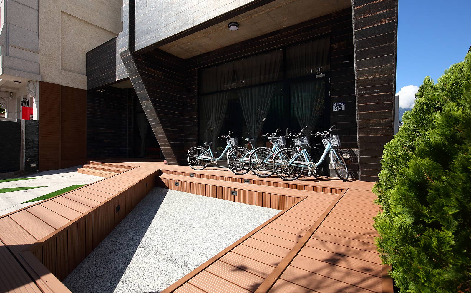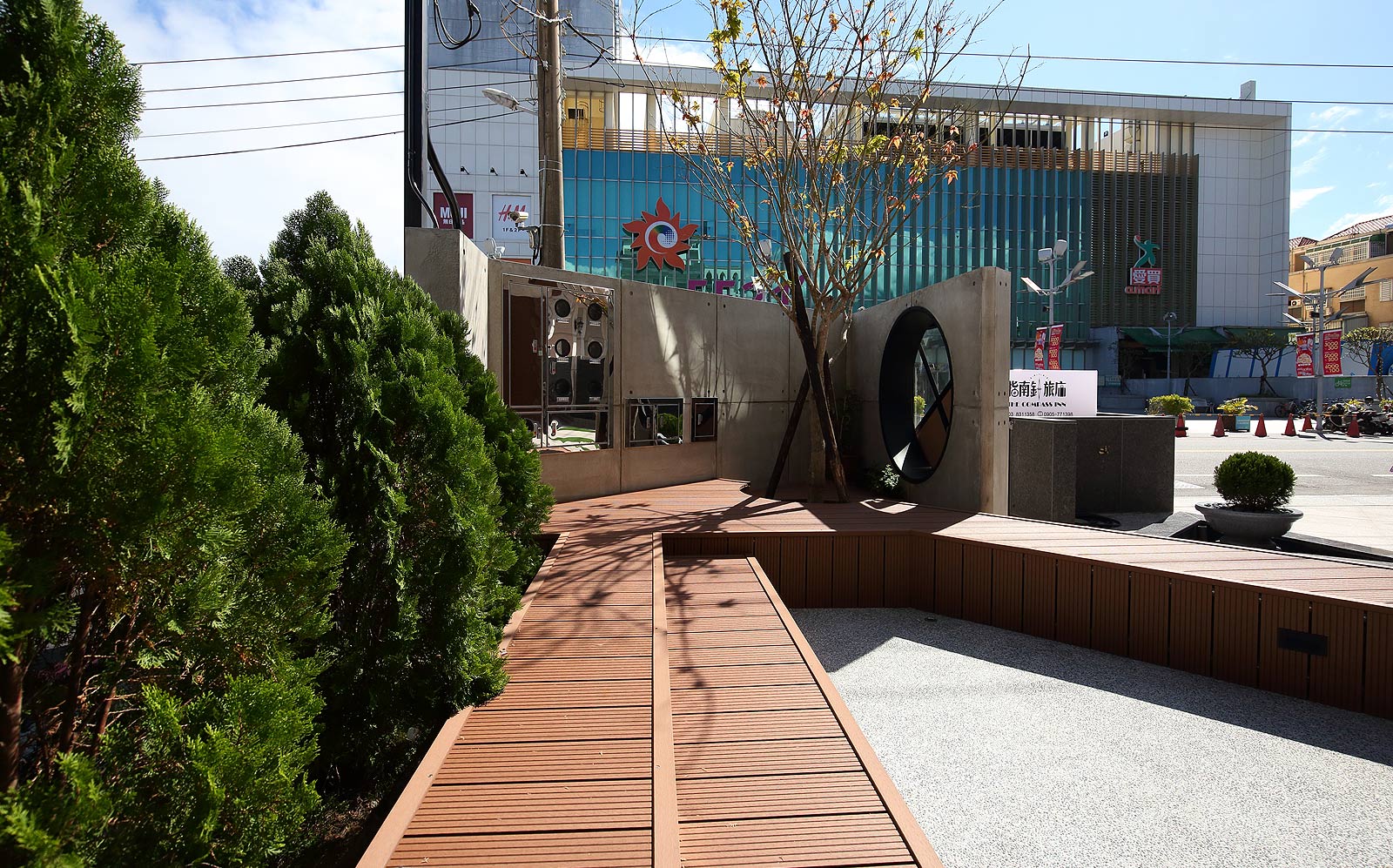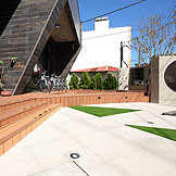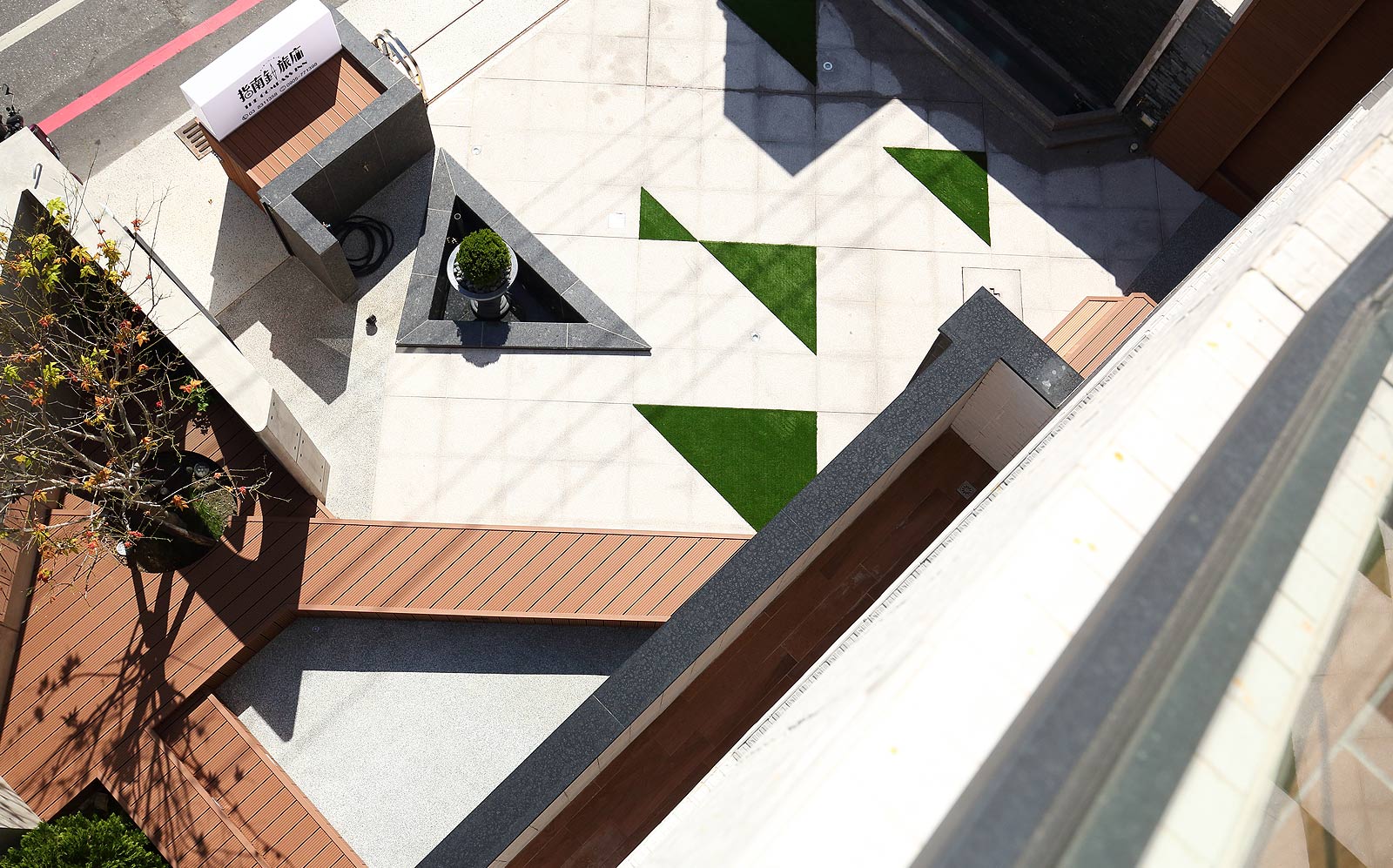 ,黑白相間配色的外觀,入口處用幾何三角構成整個平面,可供休憩聊天的平台,可以舒適的在中庭閒坐,自在的談天說地。