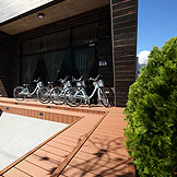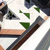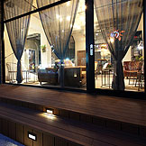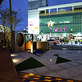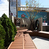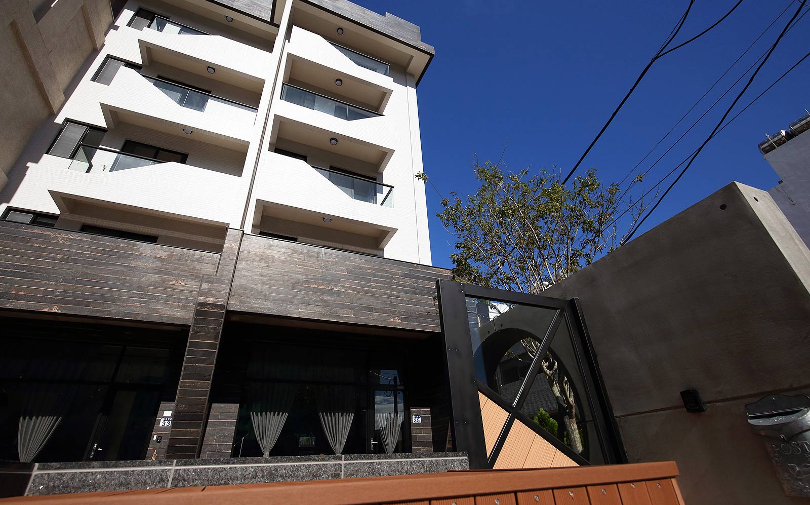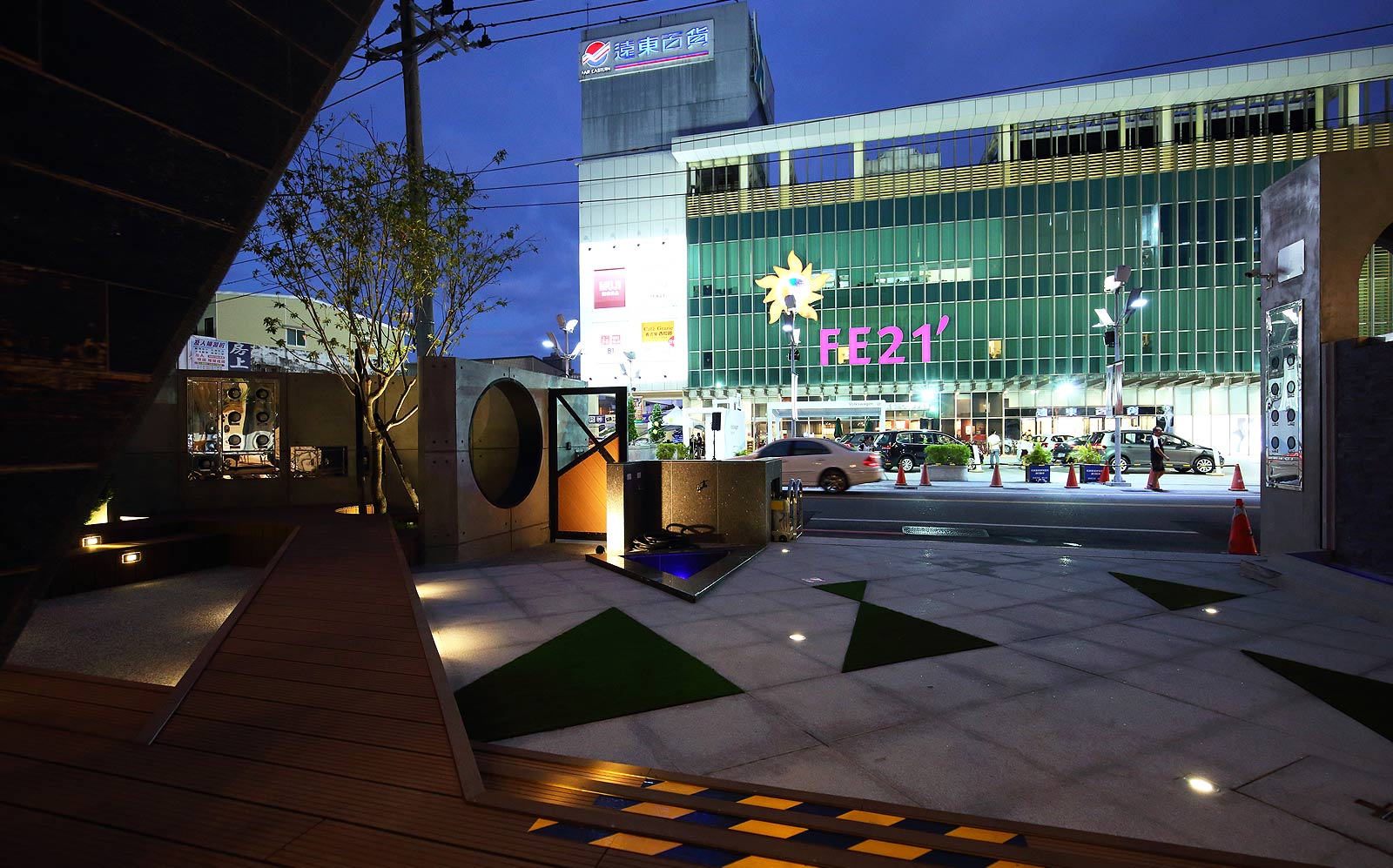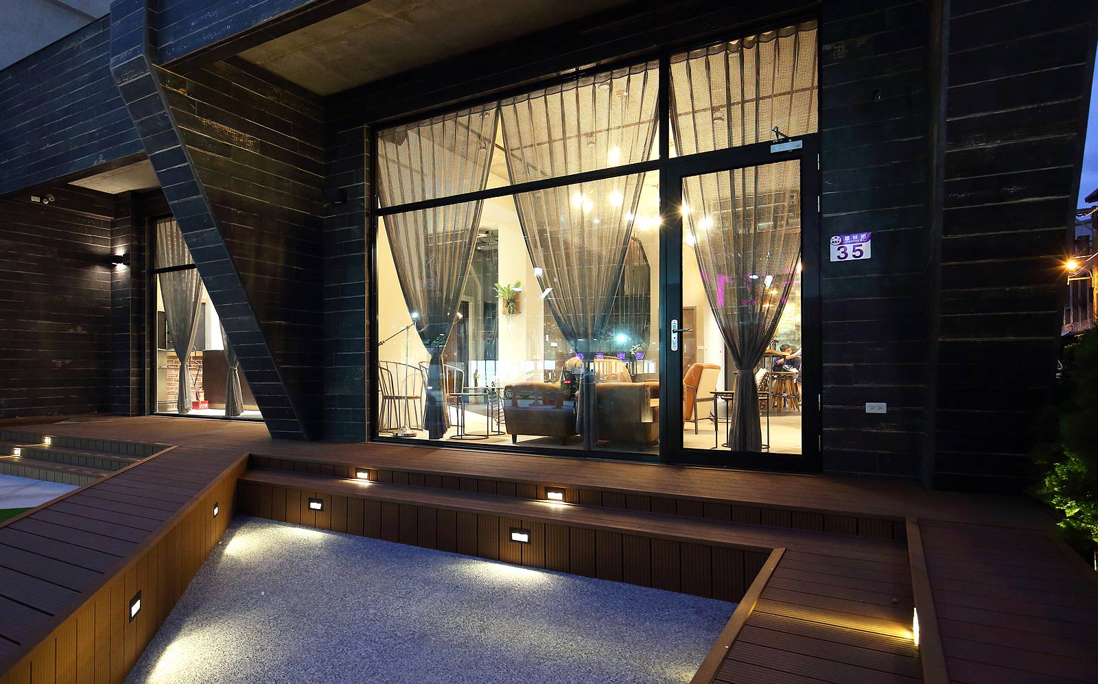 ,黑白相間配色的外觀,入口處用幾何三角構成整個平面,可供休憩聊天的平台,可以舒適的在中庭閒坐,自在的談天說地。